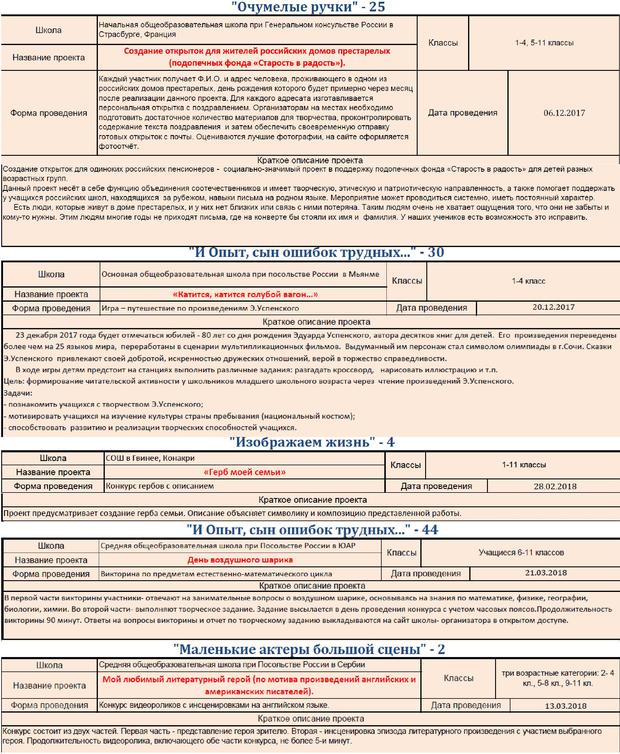 Название проекта Школа-организатор Сроки проведения Участники Блок предметов гуманитарно-эстетического цикл В лабиринте мифологии Школа Посольства России в Великобритании 28 января 5 - 7 классы «Что-то с памятью моей стало: всё, что было не со мной, помню…» Школа Посольства России в Бельгии 4 марта 8 - 11 классы «Необычное в обычном, или Чудеса в естественных науках» Школа Посольства России в ФРГ (Берлин) 26 ноября 7 - 11 классы Научный лабиринт Школа Посольства России в КНДР 11 февраля 5 - 11 классы Outstanding writer of Great Britain (William Shakespeare) Школа Посольства России в Египте 18 февраля 9- 11 классы "В царстве английской грамматики" Школа Посольства России в Австрии 11 марта 5 -8 классы "Путешествие маленькой Капли по планете Земля!" Школа Посольства России в Лаосе 10 декабря 1 - 4 классы "За Коньком-Горбунком в сказку русскую войдем" Школа Посольства России в Гвинее 8 апреля 2 - 4 классы